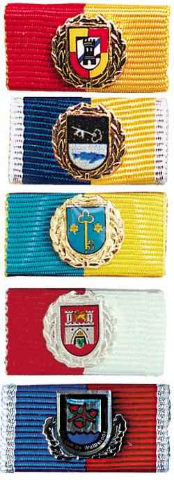 Bandschnalle in Standardgröße 25 x 12 mm zum Aufschieben inklusive einteiligem Unterteil mit Sicherheitsnadel, lieferbare Bandfarben rot, schwarz, dunkelblau, weiß, grün, rot-weiß, blau-weiß, grün-weiß, blau-rot (andere Farbkombinationen auf Anfrage!), mit Auflage in Rundform mit angeprägten Kränzen gold-, silber- oder bronzefarbig nach vorhandenem Werkzeug, Auflage mehrfarbig bedruckt mit Motiv (z.B. Ortswappen) und Schrift lt. Ihren Angaben, zusätzlich kunstemailliert