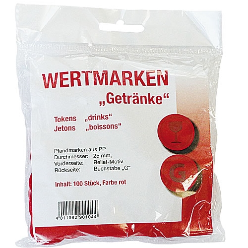Werkmarkenchips aus Kunststoff, Rot, 25 mm Durchmesser, 100 Stück im Polybeutel, Vorderseite Glassymbol, Rückseite "G"