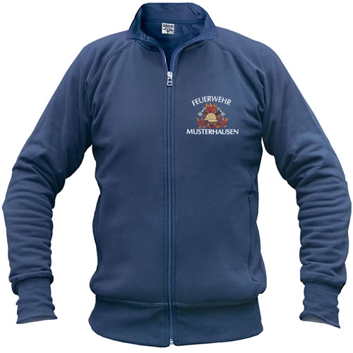 marineblau, 60% gekämmte Baumwolle/40% Polyester, ca. 320 g/qm-Qualität, innen angeraut, mit hochwertigem Nylon-Reißverschluss und Metallanhänger, sportliche Raglan-Ärmel, zwei praktische Einschubtaschen, dekorative Flatlock-Nähte, hochwertige Beleg- und Nackenspiegel-Ausführung, Rippbündchen, Elasthan in Arm- und Saumbündchen, formstabil und strapazierfähig, Größen XS-6XL, einschließlich Stickmotiv A, B, BW, C, D, E, F, FM, G, JF, KNS, LF, M, ML, MS, N, O, P, Q, R, T, THL, U, US, V, W, X, Y, oder Z, über dem Motiv z.B. halbrund "FEUERWEHR" oder "JUGENDFEUERWEHR", darunter gerade "ORTSNAME", Stickfarbe für Schrift weiß oder nach Wunsch