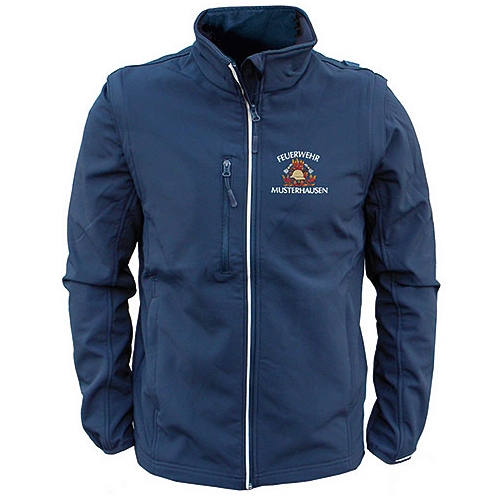 Navy, 95% Polyester / 5% Elasthan, 300 g/qm, 3-lagige, atmungsaktive Membrane 3000 g/m²/24h und wasserdicht bis 8000 mm, Zwischenmembrane atmungsaktiv, Microfleece-Innenmembrane. Reflektierende Paspelierung am Reißverschluss. 2 Seitentaschen und 1 Brusttasche mit Reißverschluss. Abnehmbare Ärmel mit reflektierender Paspelierung am Ärmelbund und Gummizug, Unisexgrößen XS-5XL, einschließlich Stickmotiv A, B, C, D, E, F, FM, G, JF, LF, M, ML, MS, N, O, P, Q, R, T, THL, U, US, V, W, X, Y, oder Z, über dem Motiv z.B. halbrund "FEUERWEHR" oder "JUGENDFEUERWEHR", darunter gerade "ORTSNAME", Stickfarbe für Schrift silbergrau oder nach Wunsch