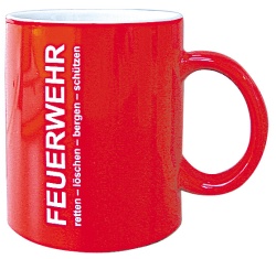 aus Keramik, außen rot, innen weiß, mit weißem Aufdruck lt. Abbildung auf beiden Seiten, Höhe 9,5 cm, Inhalt ca. 0,3l
