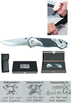 Rostfreie Edelstahlklinge mit Arretierung. Rückwärtig mit Gutschneidemesser und Scheibenzertrümmerer. Grip-Stop-Oberfläche. Messerabmessung (auseinandergeklappt) 21 cm. Inklusive Nylongürteltasche und Holzbox mit Gravurschild im Schmuckrahmen einschließlich Motiv und Schrift nach Ihren Angaben