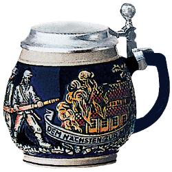Achtung: Dieser Bierkrug ist kein Spielzeug und darf nicht von Kindern verwendet werden. Vorsicht beim Gebrauch, da der Krug durch heiße oder kalte Getränke brechen kann und dabei Verletzungen verursachen könnte. Der Zinndeckel kann sich bei unsachgemäßer Handhabung lösen und Verletzungen verursachen. Auf scharfe Kanten prüfen um Verletzungen zu vermeiden. Bitte nur für den vorgesehenen Zweck verwenden und vor Gebrauch auf sichtbare Schäden prüfen.