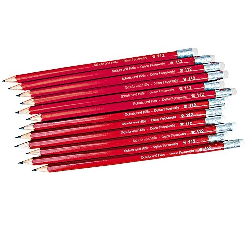Klarsichtetui mit 12 roten Sechskant-Bleistiften (19 cm lang) mit Radiergummispitze und silberfarbiger Prägung "Schutz und Hilfe - Deine Feuerwehr Telefon 112"
