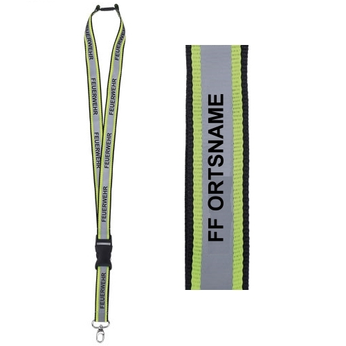 Textilschlüsselbänder (Keyholder/Lanyards) aus Polyester, 2-farbig Schwarz-Neongelb gewebt, mit Silber reflektierendem Streifen, schwarz bedruckt mit umlaufender Schrift z.B. FEUERWEHR + Ihrem ORTSNAMEN oder Text nach Wunsch. Ausgestattet mit Sicherheitsclip im Nacken, Plastikclip und Schnappkarabiner, 900 x 25 mm