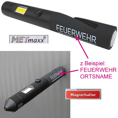 Das ideale Tool für mobile Menschen - extrem sparsame und starke COB Sicherheits-Flutlichtlampe in Kombination mit Magnethalter für Reparaturen, gleichzeitig aber auch Ihr Sicherheitstool mit Nothammer (speziell gehärteter Stahl) und Gurtcutter. Einschließlich weißem Aufdruck nach Ihren Wünschen, z.B. FEUERWEHR + Ihr ORTSNAME. Inklusive Batterien. Größe 150 x 22 mm Ø