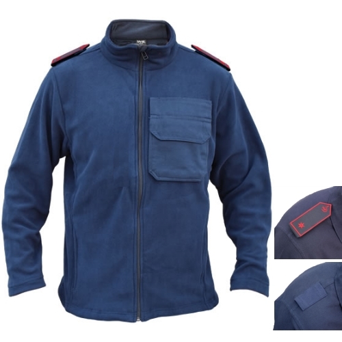 Navy (innen Silbergrau), 100% Polyester, 320 g/qm-Qualität, Stehkragen, Qualitäts-Reißverschluss, Einschubtaschen mit Ziernaht, Elasthanbündchen am Arm, Antipilling-Ausrüstung, inklusive aufgenähter großer Brusttasche mit Klettverschluss und Kugelschreibereinschub sowie aufgenähte Schultertunnel für Schulterstücke (Lieferung OHNE Schulterklappen). Tasche und Schultertunnel in Kontrastmaterial und -farbe!