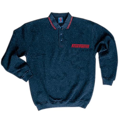 Mischgewebe, marineblau, mit roten Kontraststreifen am Kragen, ca. 320 g/qm, innen angerauht, Kappnähte, Knopfleiste, Nackenband, inklusive roter Direktbestickung „FEUERWEHR mit langem F«