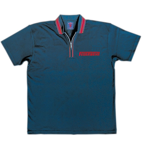 100 % Baumwolle, marineblau, mit roten Kontraststreifen an Kragen und Reißverschluss, ca. 200 g/qm, gekämmt, gewirkte Pique-Ausführung, Kragen, Zip-Reißverschluss, Nackenband, reaktiv eingefärbt, ¼ Arm, ohne Ärmelbündchen, inklusive roter Direktbestickung „FEUERWEHR mit langem F«